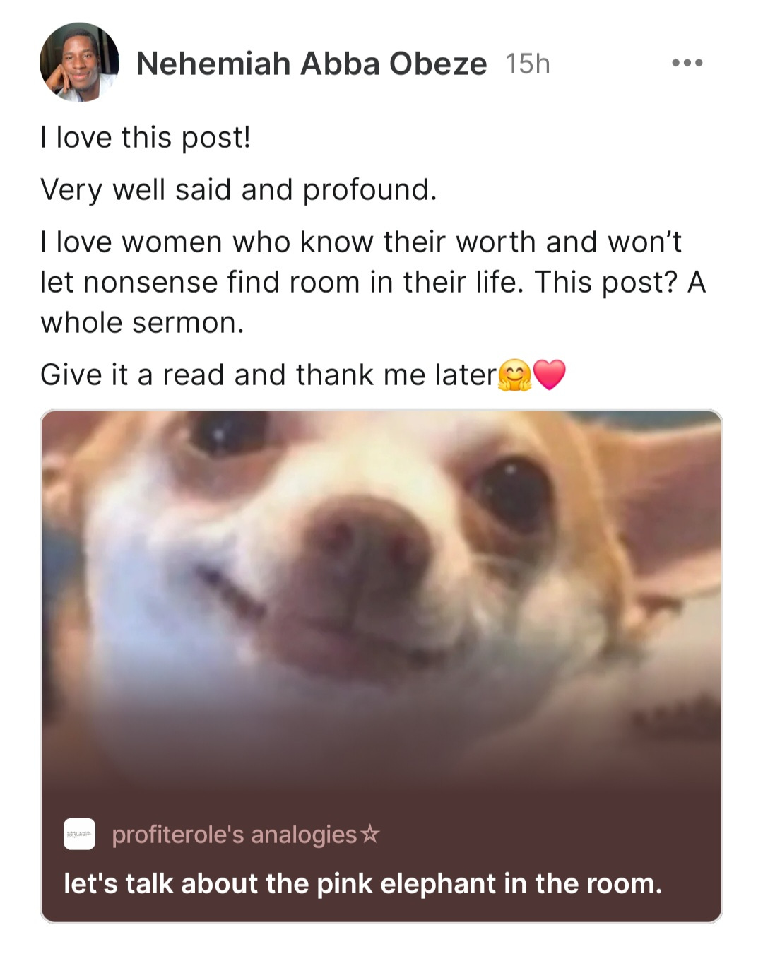 I think about the very first time I joined Substack, which was maybe around May 16th, and the very first post I read was one of Wunmiās posts, which was about the insensitivity of Nigerians saying it's never that deep. It was so relatable that I wanted to read more if her works and I remember messaging her and telling her about a similar post I wrote on Medium, so I sent her the link and she read it and she had so many nice things to say about the post that I was overjoyed. It meant I knew how to write a good amount because, I mean LOOK AT WHAT SHE WROTE. You can read that here:
