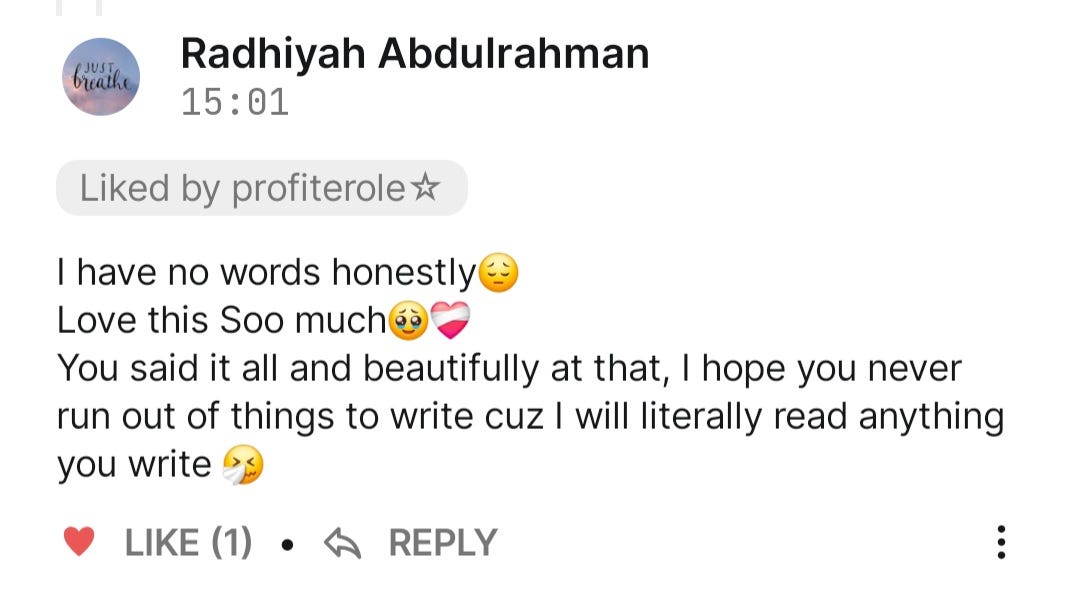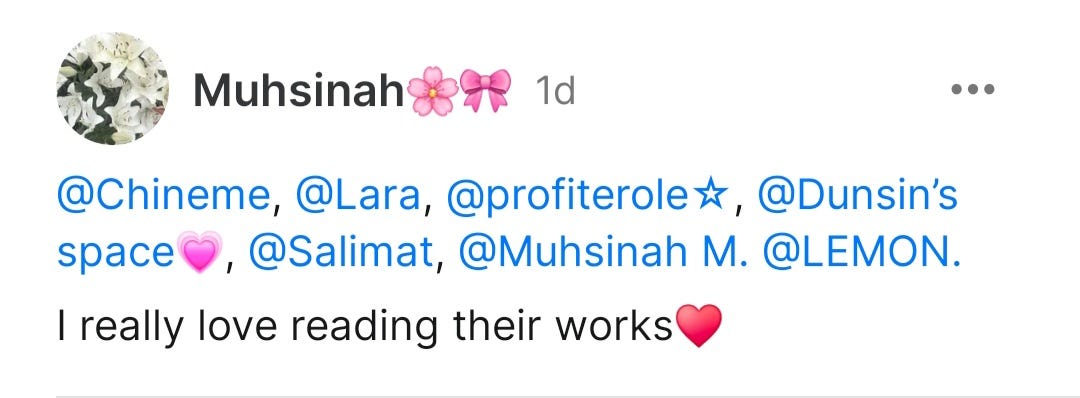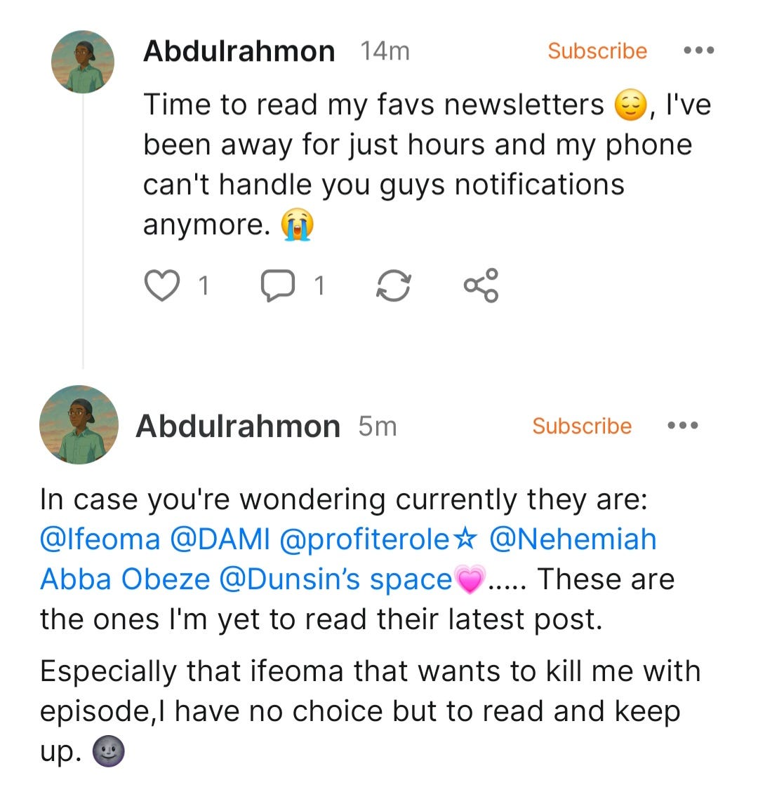 There's Ifeoma (my word lover!) who always restacks quotes from my posts. I like the little things she shares with me. I like the fact that she's such a jovial and fun person to converse with. I like that she calls me Bambito, lol. There's Bisayo, I can always count on her to give out the most beautiful comments because that's how much of a loving person she is. I like how whenever she texts me on Substack she says āmy loveeeeee!ā There's Radhiyahš·, that girl and the way she engages in all my notes and posts. She likes everything and she sees everything lol. There's Abdulrahmon who I can always count on to comment and vibe with my posts. Then there's ššššššššā, even though he's looking for my trouble alot these days. I can't even put how much I love all of them into words.